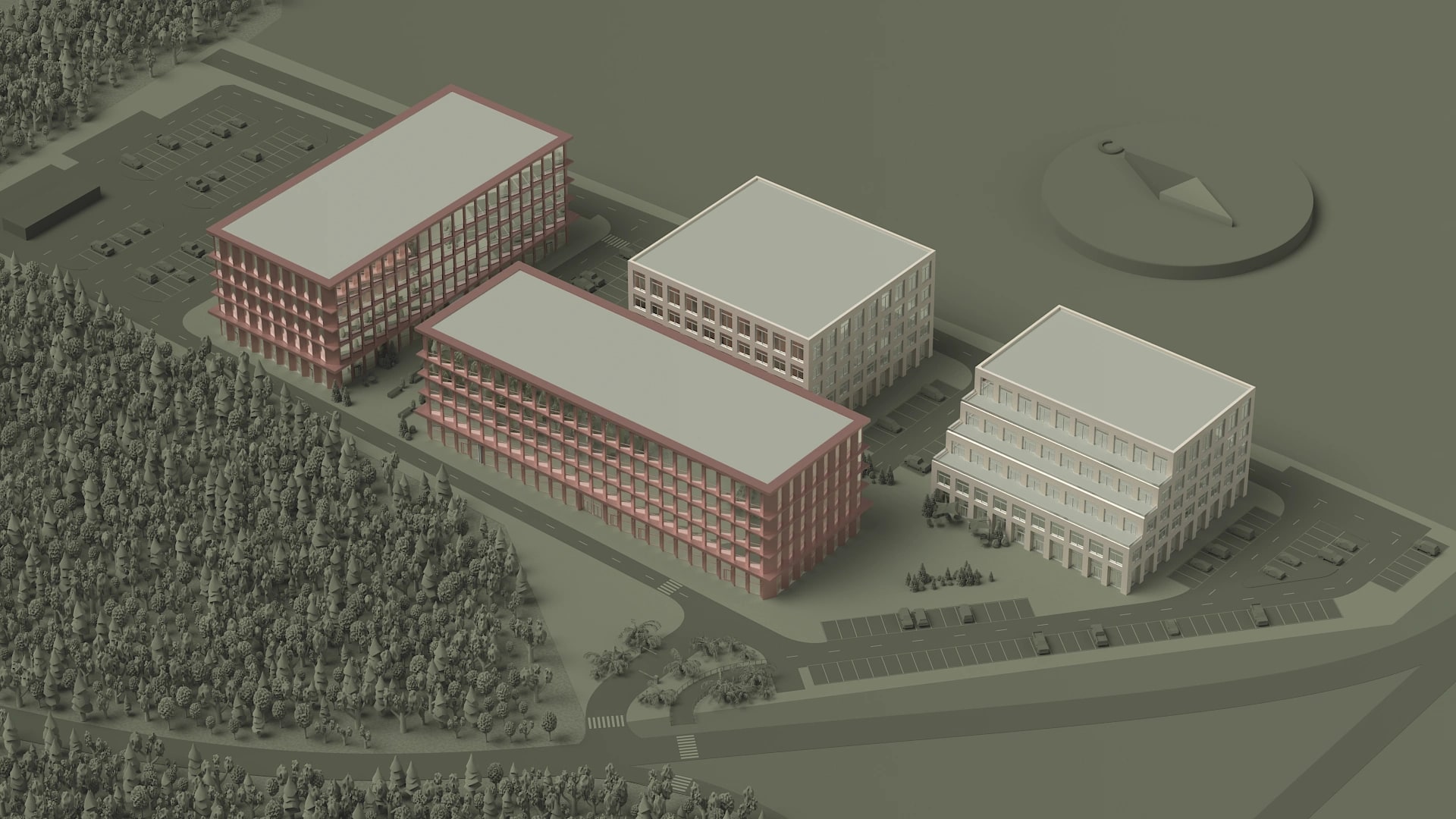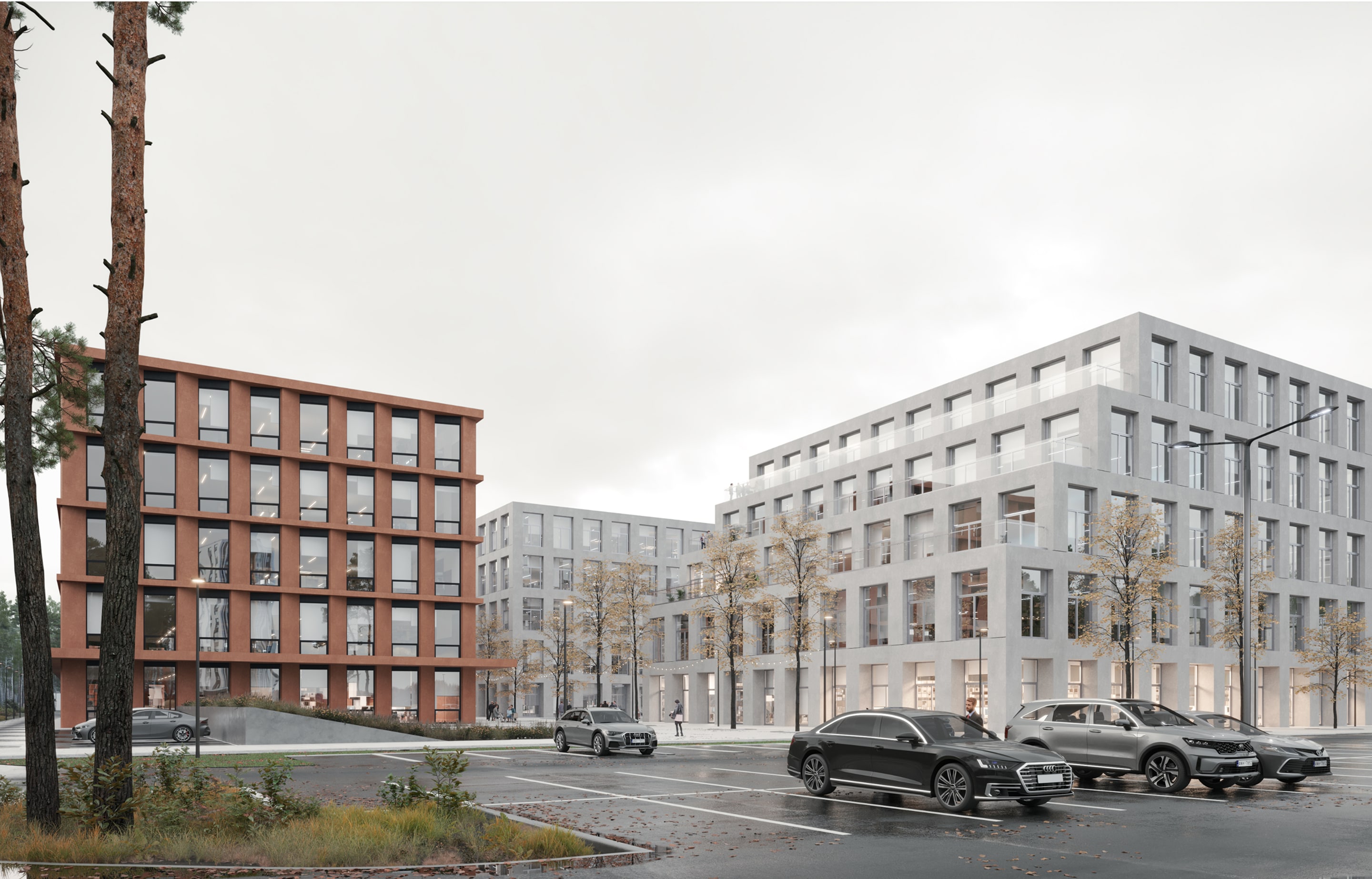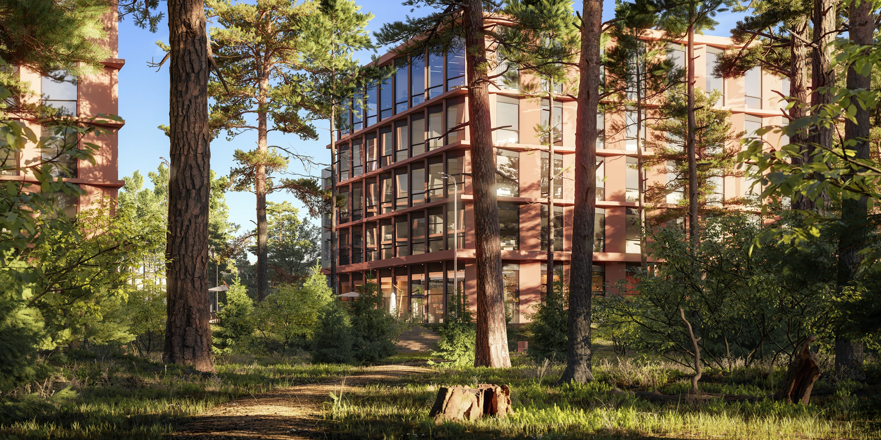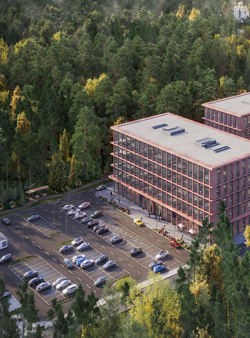 Терракота и светлый камень фасадов контрастируют друг с другом и дополняют краски природы, которая отражается в панорамных окнах комплекса. Небольшая высотность зданий создает комфортную для человека, вдохновляющую среду. Расположение офисов максимизирует виды на лес и прогулочный бульвар, расположенный в центре бизнес-парка. Вечером здания преображаются архитектурной подсветкой