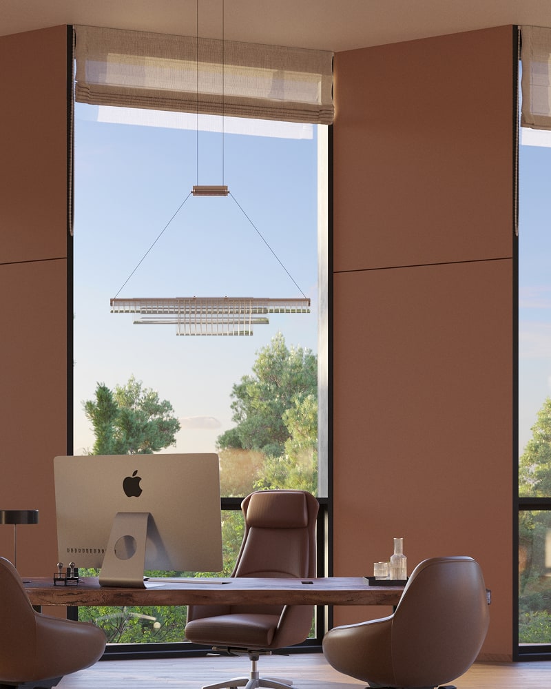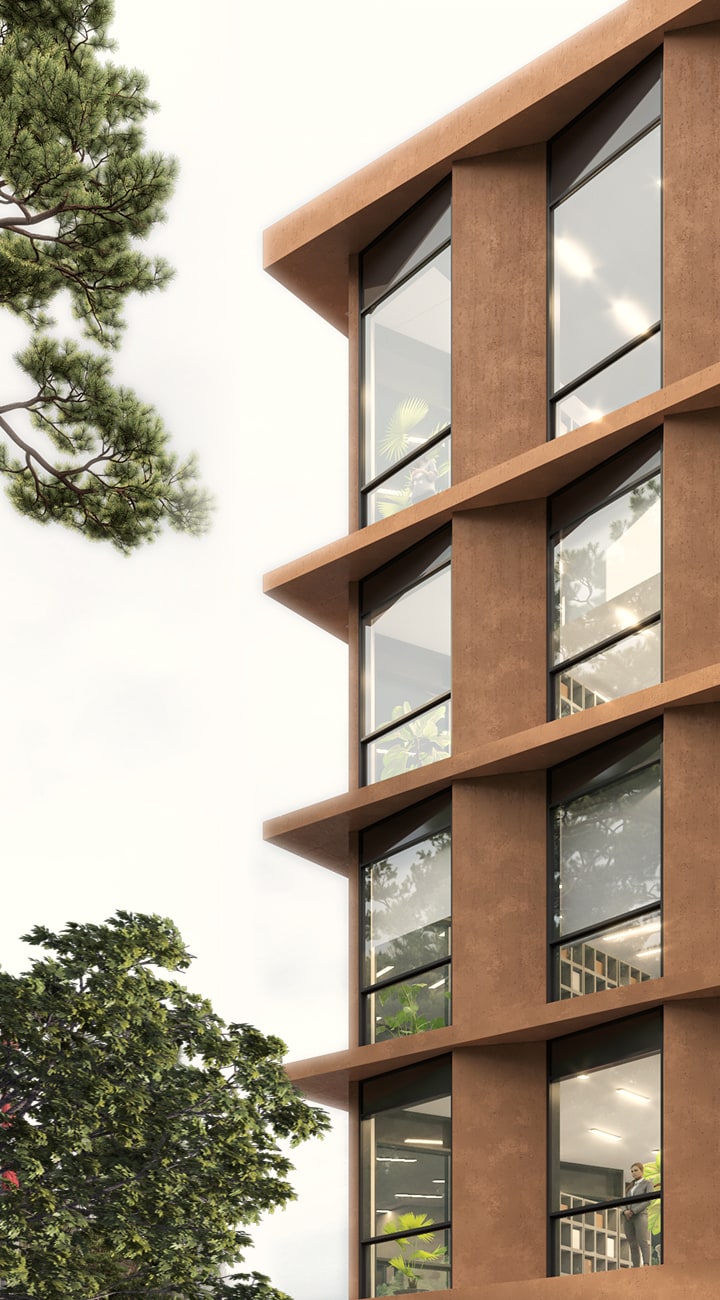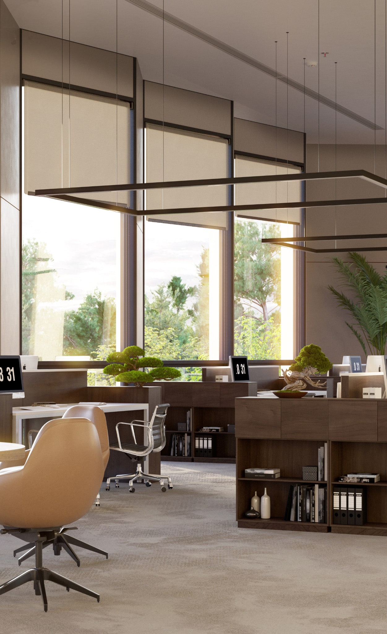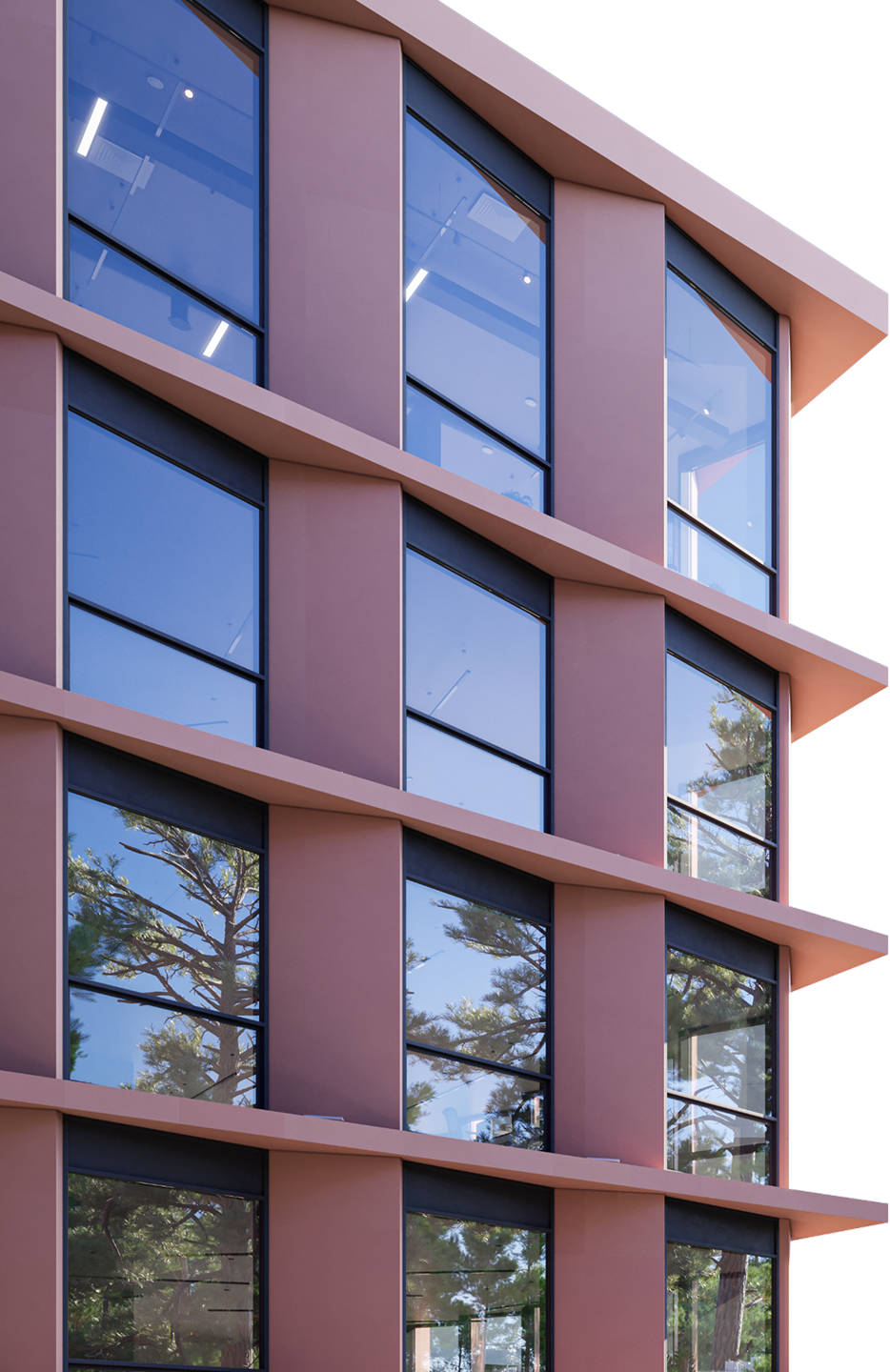 Терракота и светлый камень фасадов контрастируют друг с другом и дополняют краски природы, которая отражается в панорамных окнах комплекса. Небольшая высотность зданий создает комфортную для человека, вдохновляющую среду. Расположение офисов максимизирует виды на лес и прогулочный бульвар, расположенный в центре бизнес-парка. Вечером здания преображаются архитектурной подсветкой