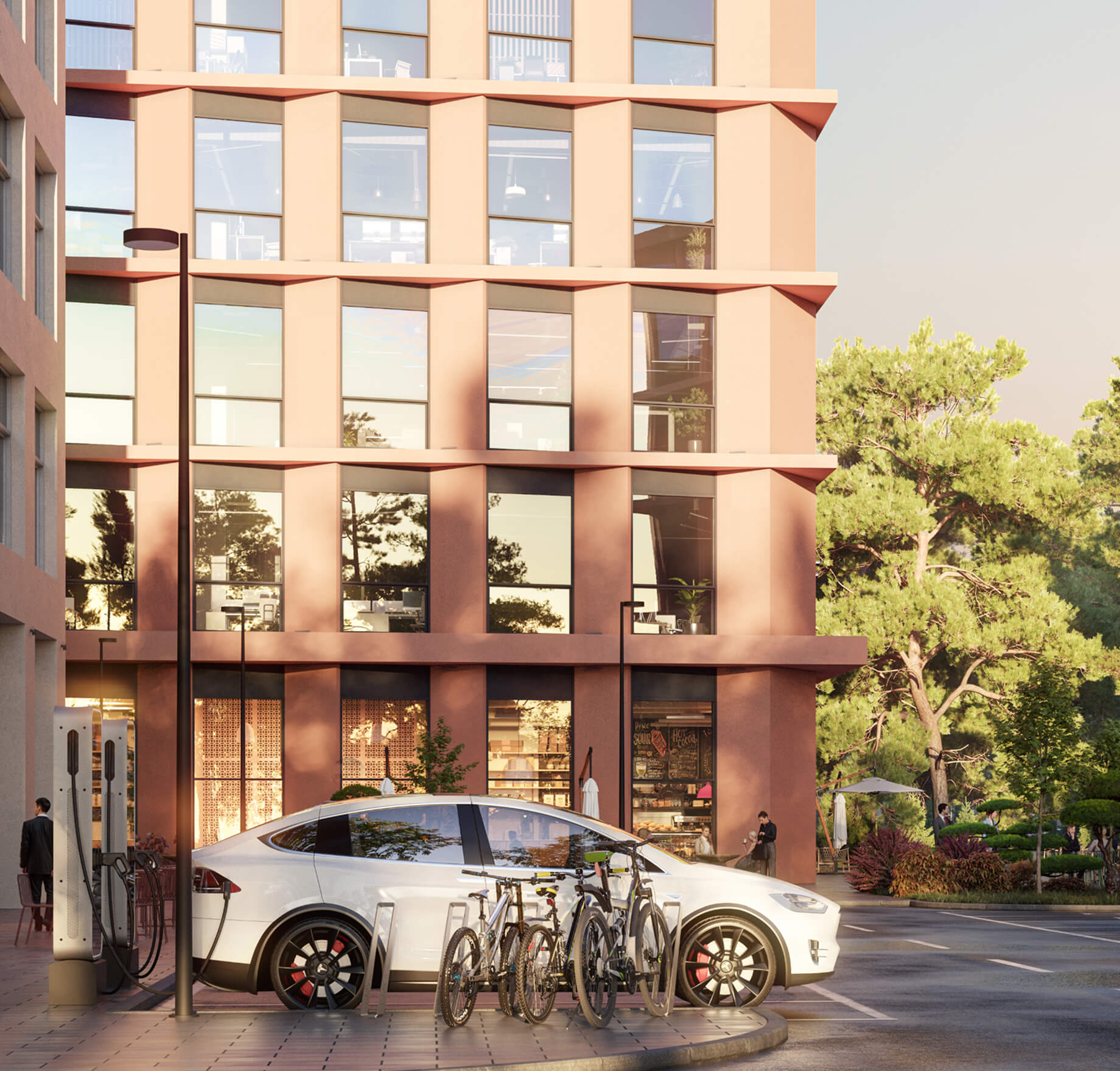 Оборудованы зоны для велосипедов и самокатов, предусмотрены зарядные станции для электромобилей.